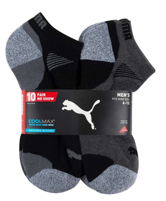 Puma Men's No Show Socks Coolmax 10 Pairs, Black / Gray, Shoe Size 6-12