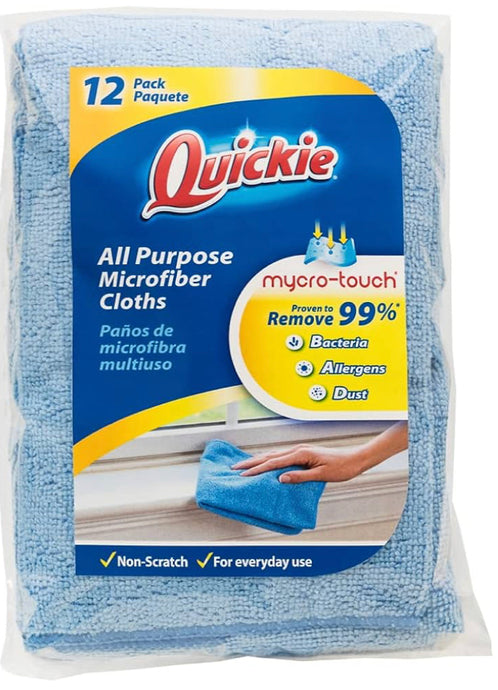 Quickie Chiffon de nettoyage en microfibre 14 x 14 pouces, bleu, paquet de 12 serviettes/essuie-glace tout usage pour le nettoyage