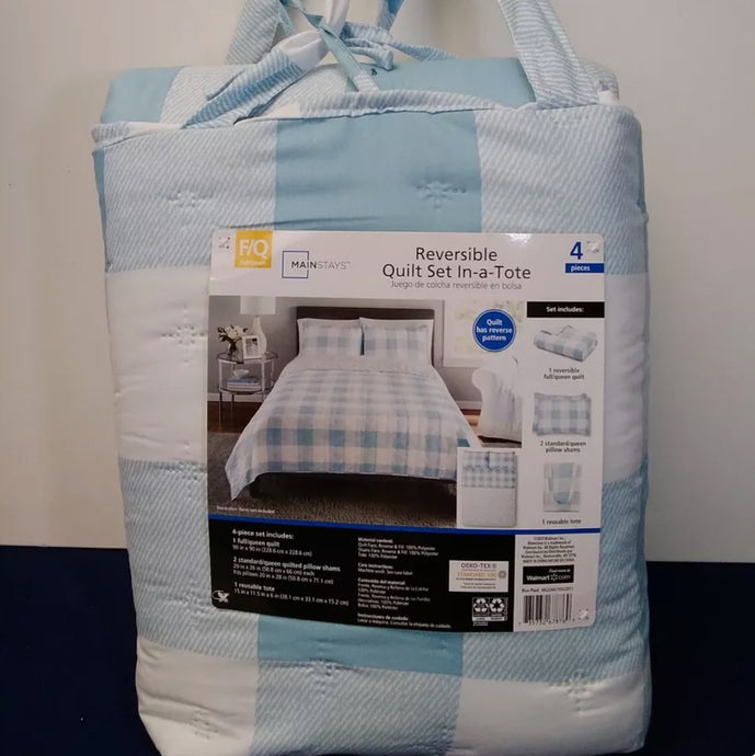 Reversible Quilt Set in-A-Tote 4 Pieces Full/King Blue/White Checker