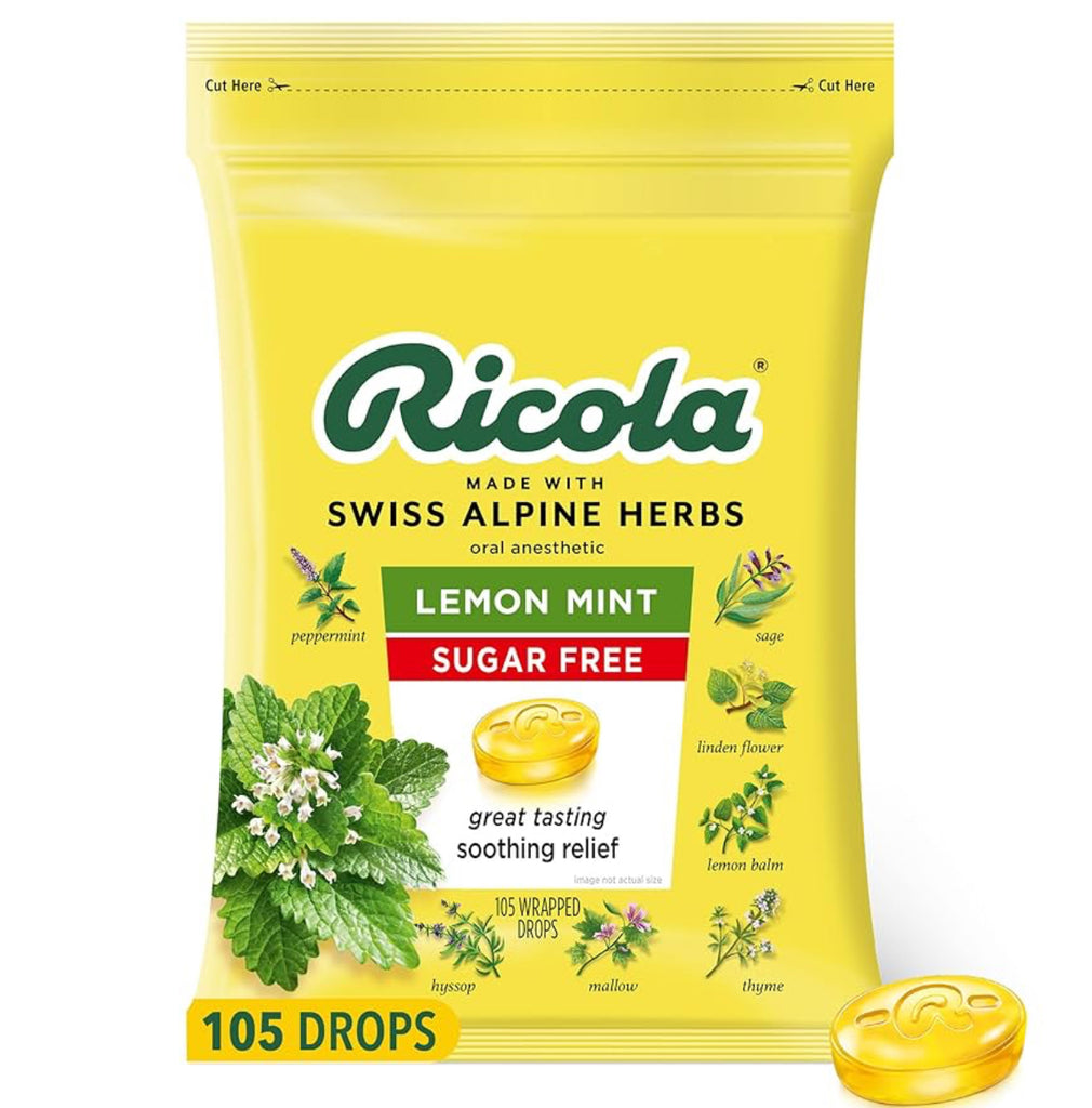 Ricola Sugar Free Lemon Mint Herbal Cough Suppressant Throat Drops, 105ct Bag DLC: 08 Mai26